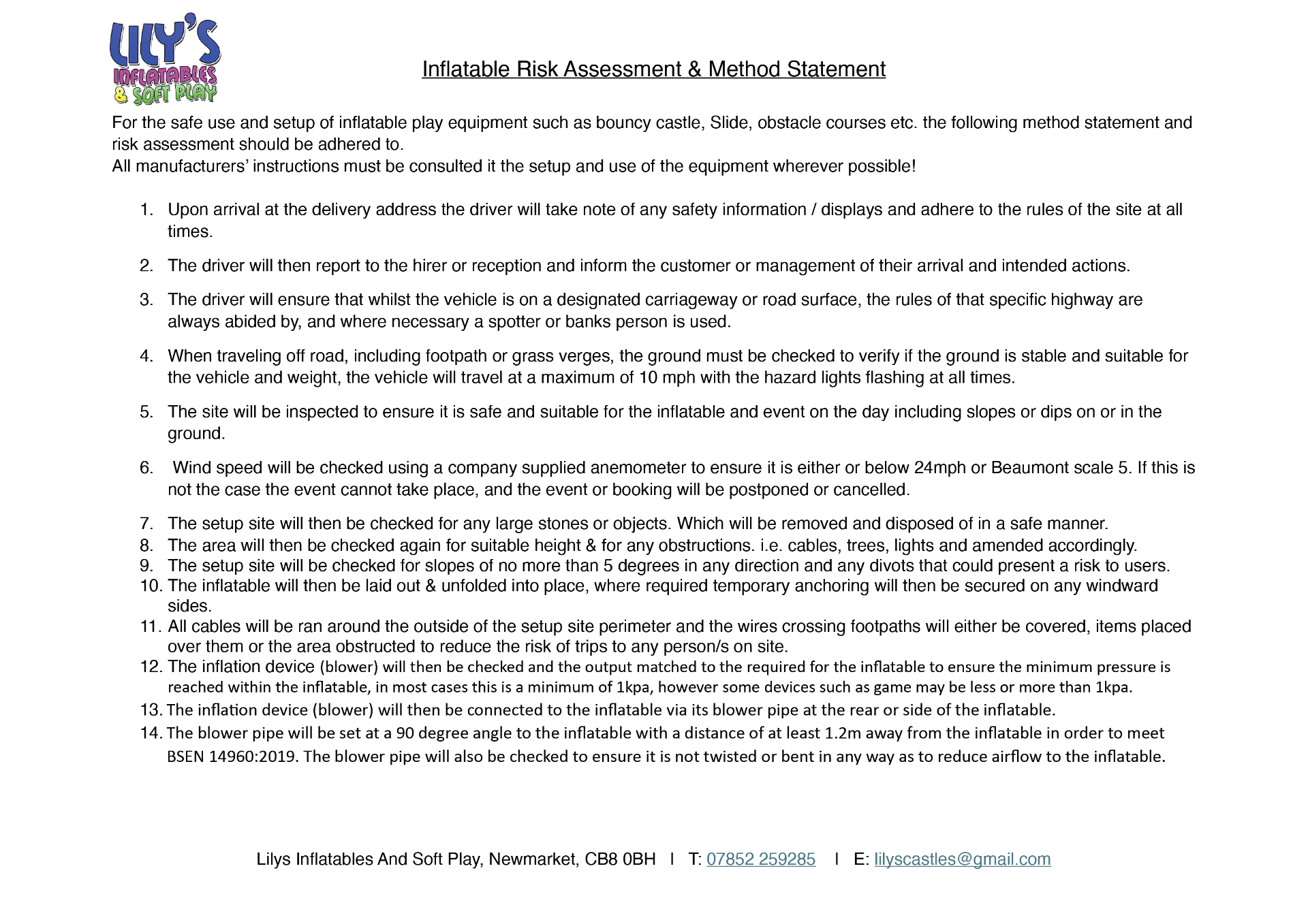 Please click here to download our Inflatable Risk Assessment Method Statement