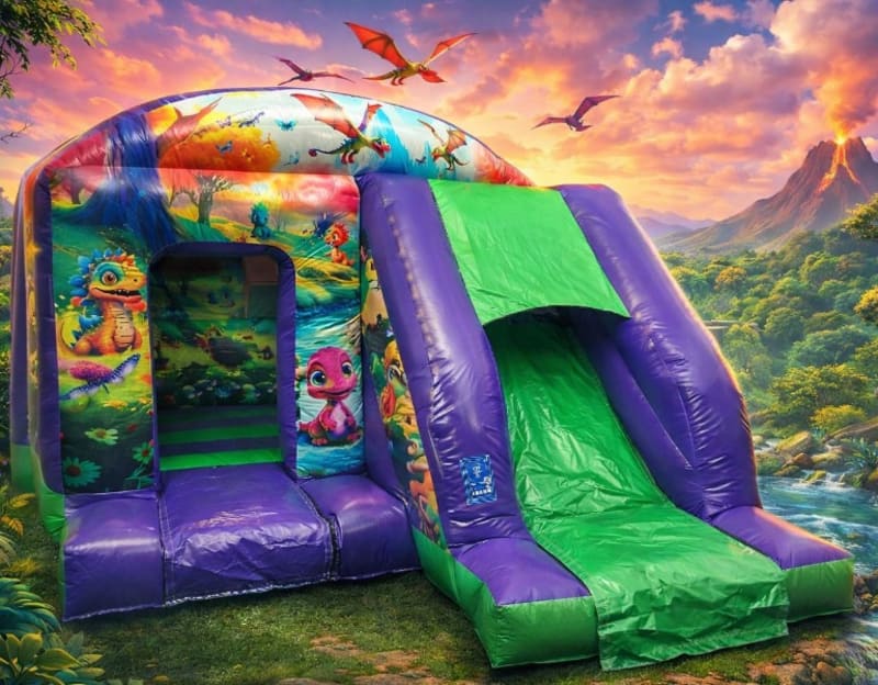 Our Dinosaur Bounce and slide Bouncy Castle is a great way to get your guests active they can Jump and play in the Bouncy Castle, Climb up the Inflatable Slide and slide down to the ground.