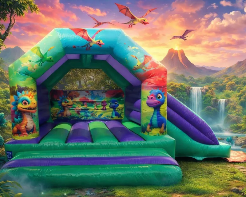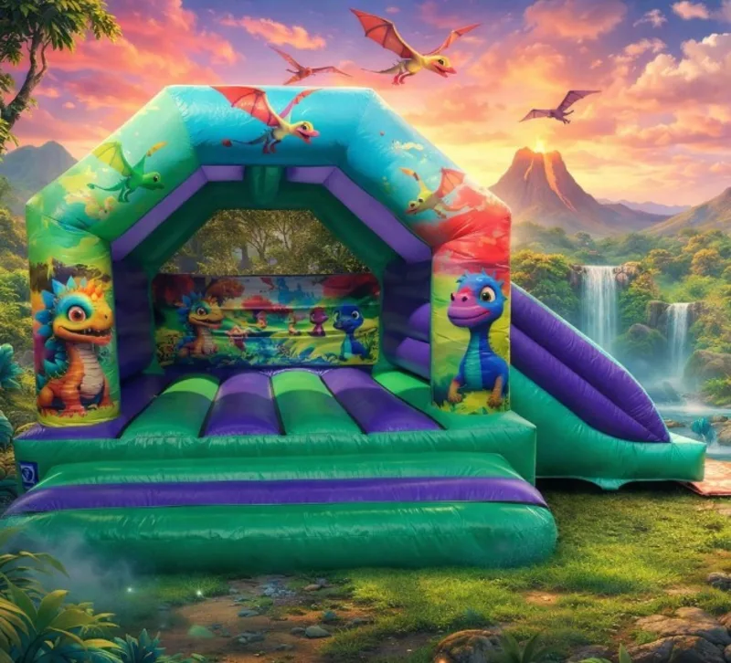 Here is our Beautiful Dinosaur side slide Bouncy castle, this is great for any Dinosaur fan.