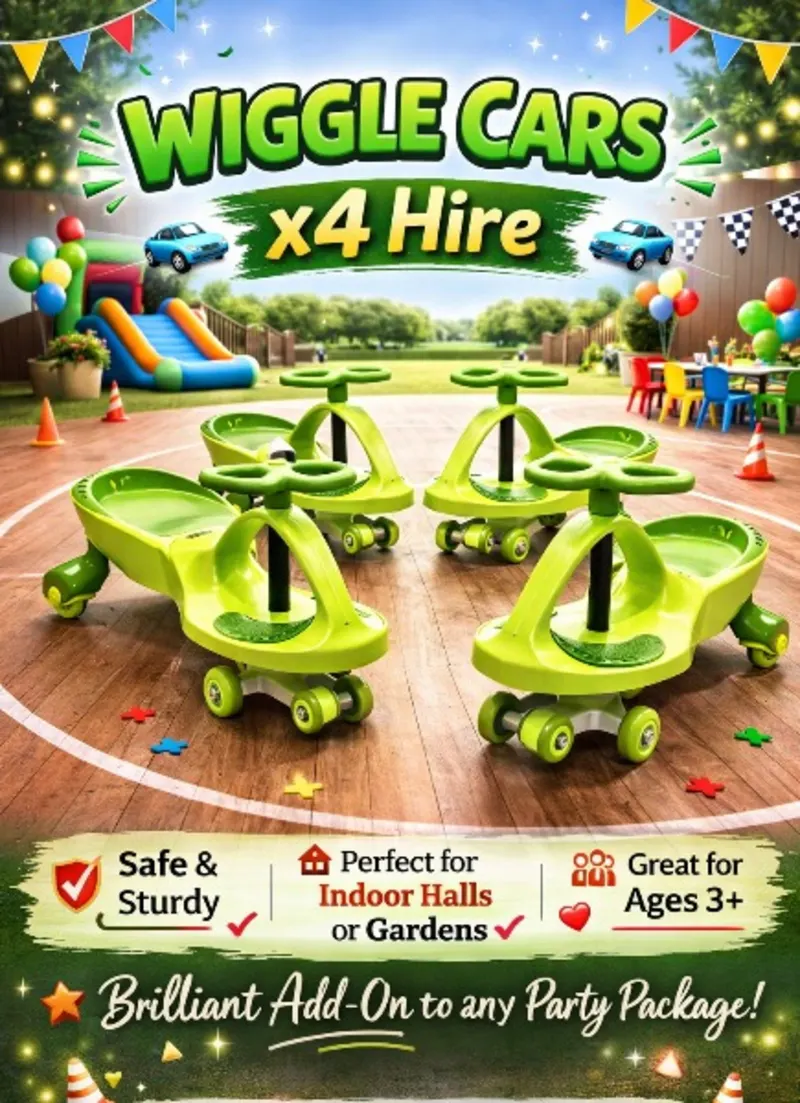 Here are our Green wiggle cars for hire they are great fun for hall hires and a great little extra to keep kids and adults entertained for hours.You will get 4 wiggle cars with this order