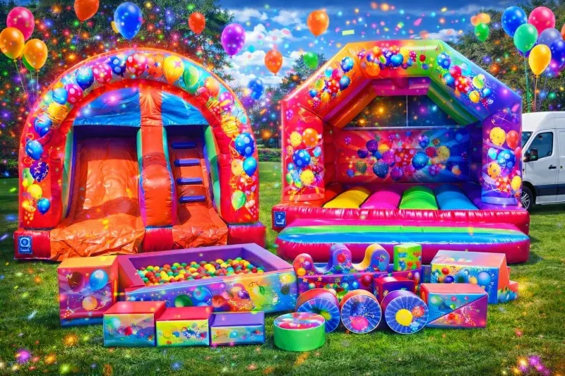 Our amazing Multi coloured Bouncy Castle, Inflatable Slide and Soft Play package