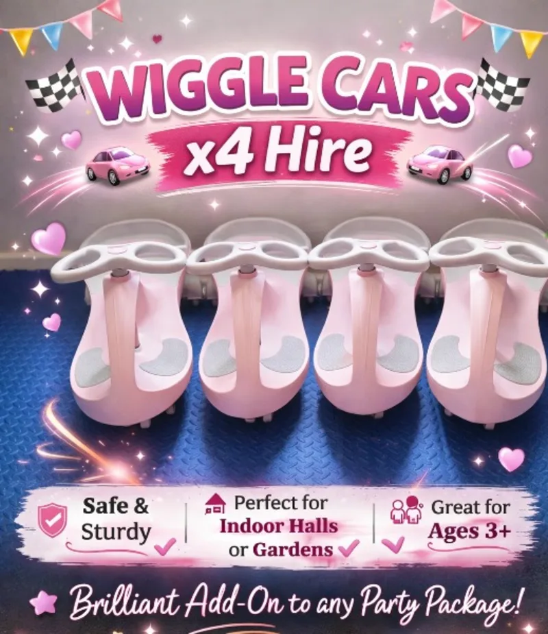 Here are our Pastel Pink wiggle cars for hire they are great fun for hall hires and a great little extra to keep kids and adults entertained for hours.You will get 4 wiggle cars with this order