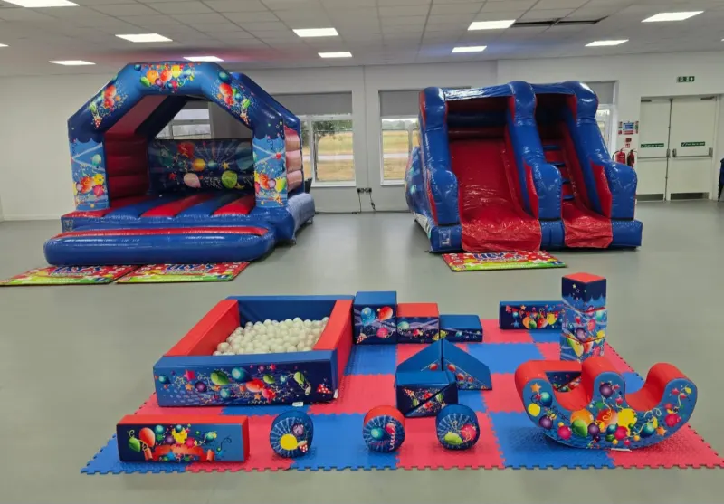 This is a great package for ages up to 12years, with its 5ft Red and Blue Party Slide, 12ft by 12ft Bouncy Castle, and matching soft play.