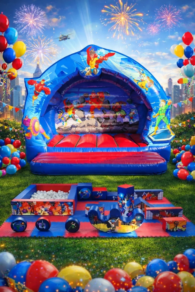 Here is our Superhero Package with its amazing Bouncy Castle and Matching Soft Play this package is going to be a massive hit. This package includes 17piece soft play shapes, ball pool, and balls and matching bouncy castle.