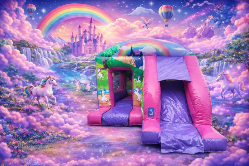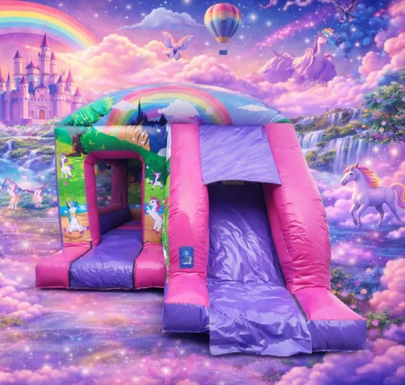 The Unicorn theme has Unicorns, a bright Pink and Purple colourful scheme related This Unicorn Bouncy Castle is great as its a bouncy castle and a slide in one!!!